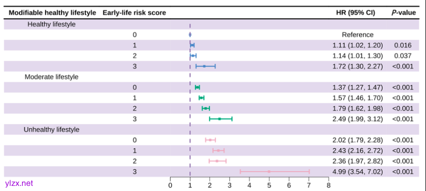 综上所述,在这项大型前瞻性队列研究中,观察到无论后天的遗传风险和生活方式如何,早期生活中累积的风险因素均与成年后T2D患病风险的增加呈剂量反应关系。这些结果强调了早期生活中有效干预策略对于全生命周期预防T2D的重要性。