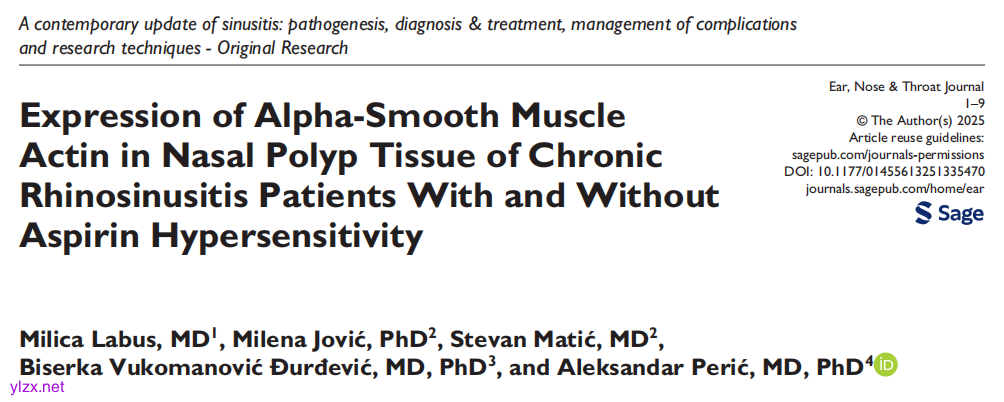 Labus M, Jović M, Matić S, Vukomanović Đurđević B, Perić A. Expression of Alpha-Smooth Muscle Actin in Nasal Polyp Tissue of Chronic Rhinosinusitis Patients With and Without Aspirin Hypersensitivity. Ear Nose Throat J. 2025 Apr 23:1455613251335470. doi: 10.1177/01455613251335470. Epub ahead of print. PMID: 40269337.