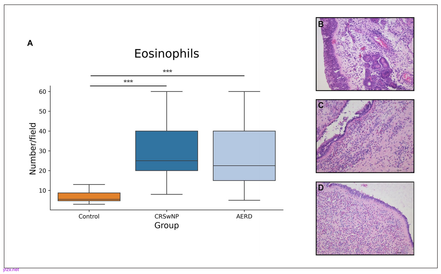 本研究纳入了阿司匹林敏感型鼻息肉患者、阿司匹林不敏感型鼻息肉患者及健康对照者,根据其症状严重程度、内镜检查结果及影像学表现进行评估。研究通过检测手术切除的鼻息肉组织或健康鼻黏膜中上皮下及血管周围区域α-SMA的表达,对肌成纤维细胞数量进行定量分析。同时对所有受试者组织样本的上皮下区域进行嗜酸性粒细胞计数。