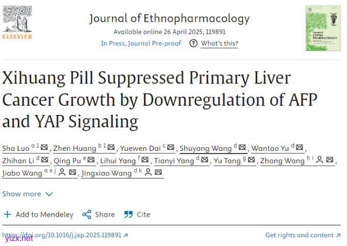 Luo S, Huang Z, Dai Y, et al. Xihuang Pill Suppressed Primary Liver Cancer Growth by Downregulation of AFP and YAP Signaling. J Ethnopharmacol. Published online April 26, 2025. doi:10.1016/j.jep.2025.119891