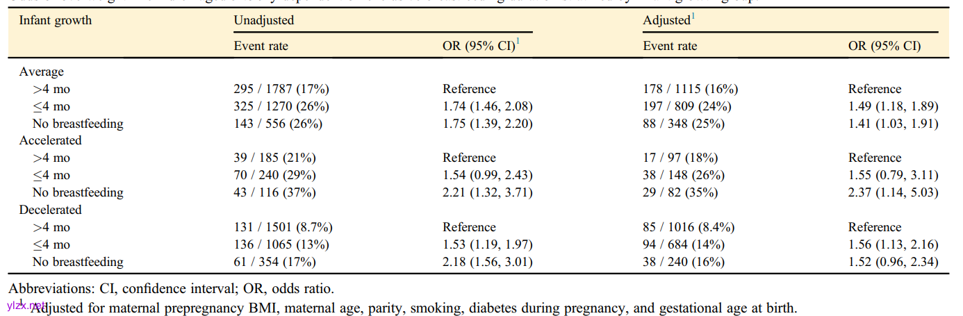 · 加速生长组中,未母乳喂养婴儿超重率为35%(29/82),显著高于>4个月组的18%(17/97)。