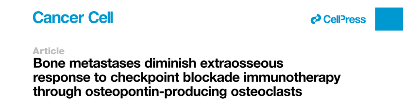 Bone metastases diminish extraosseous response to checkpoint blockade immunotherapy through osteopontin-producing osteoclasts. Cancer Cell. 2025 Apr 24:S1535-6108(25)00137-0. doi: 10.1016/j.ccell.2025.03.036. Epub ahead of print. PMID: 40280123.