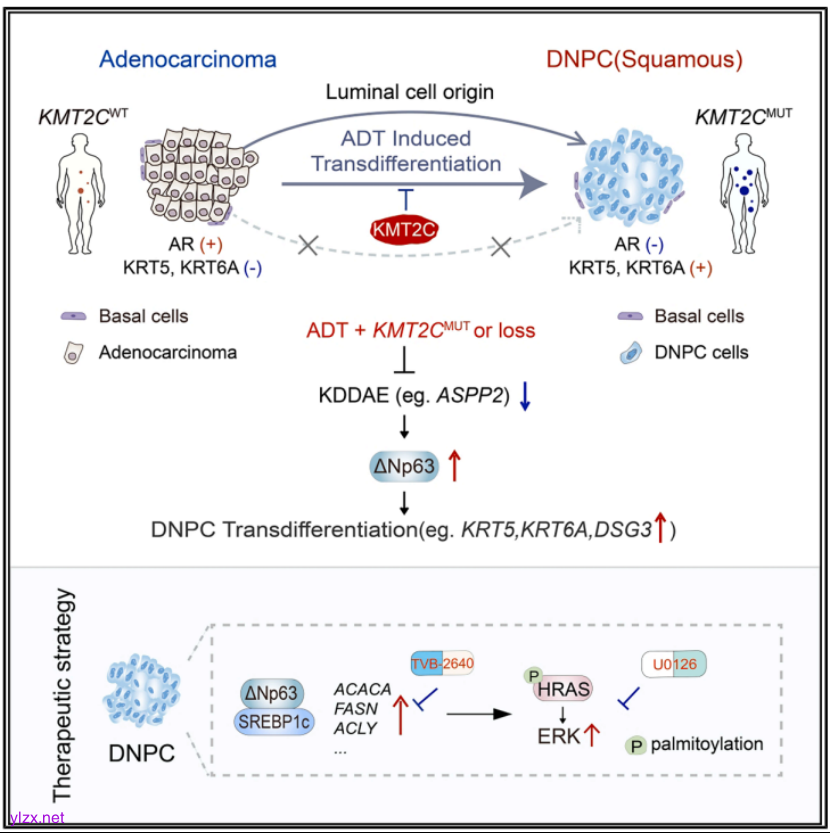 综上所述,该研究为理解DNPC的发生机制提供了新的视角,并强调了KMT2C在前列腺癌转分化中的关键作用。研究结果表明,靶向脂肪酸合成可能是治疗DNPC的有效策略。通过抑制脂肪酸合成,可以阻断HRAS的棕榈酰化,进而抑制MAPK信号通路的激活,从而抑制DNPC的生长。这一发现为开发新的治疗靶点和药物提供了理论基础,有望改善DNPC患者的预后。未来的研究可以进一步探索KMT2C在其他癌症中的作用,并验证靶向脂肪酸合成在临床治疗中的应用潜力。