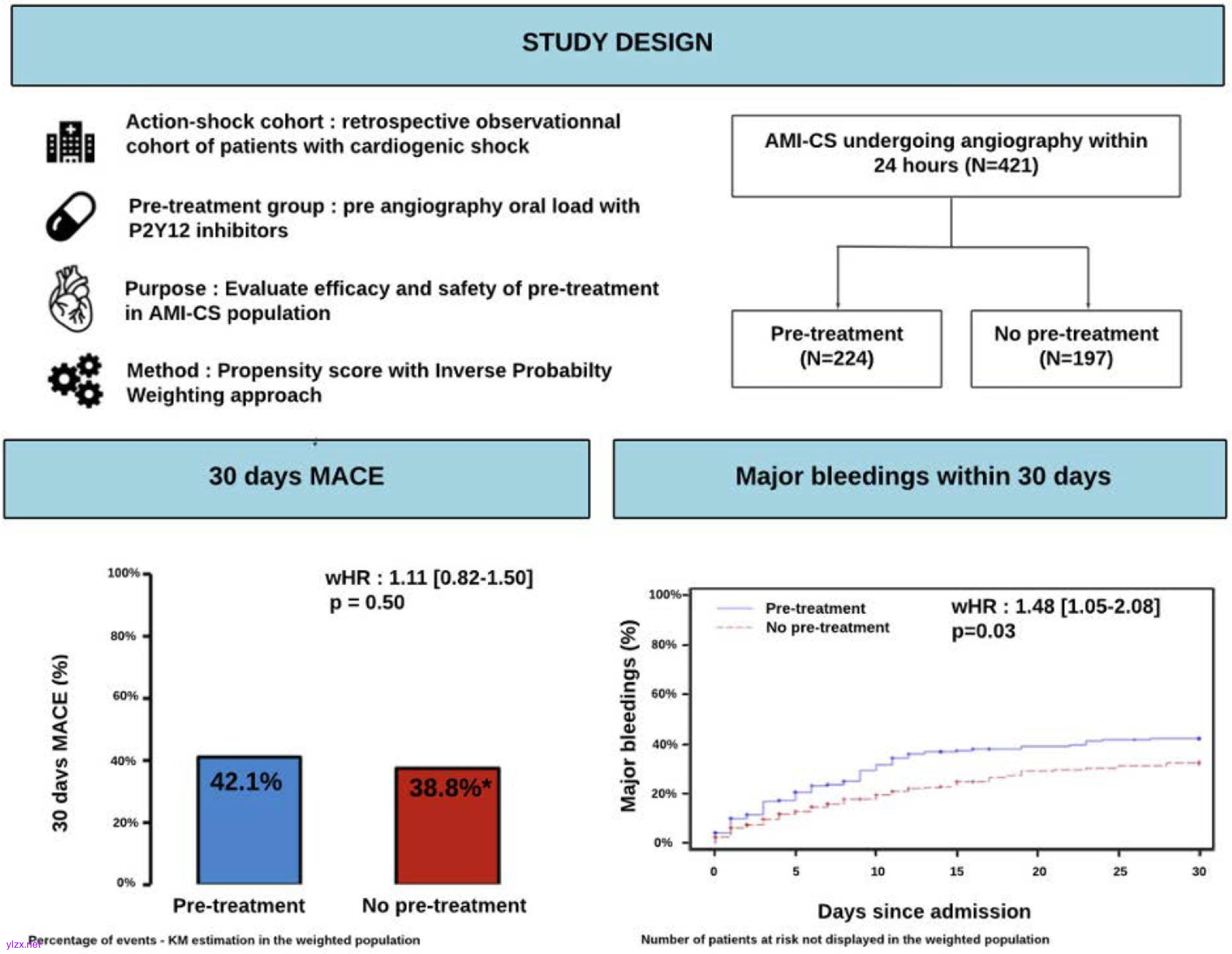 研究人员使用ACTION-SHOCK队列,纳入了2012年至2023年间住院的急性心肌梗死-心源性休克患者,入院后24小时内接受冠状动脉造影。预处理的定义是在血管造影前口服P2Y12抑制剂的负荷剂量。研究人员使用逆概率加权(IPW)方法评估了预处理与入院后30天主要不良心血管事件(MACE)或大出血之间的关系。MACE被定义为全因死亡、缺血性卒中、心肌梗死或支架血栓形成的组合。出血学术研究联盟将大出血定义为3级、4级或5级。