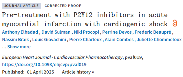 Anthony Elhadad,et al.Pre-treatment with P2Y12 inhibitors in acute myocardial infarction with cardiogenic shock.European Heart Journal-Cardiovascular Pharmacotherapy. 2025.https://academic.oup.com/ehjcvp/advance-article/doi/10.1093/ehjcvp/pvaf019/8102938