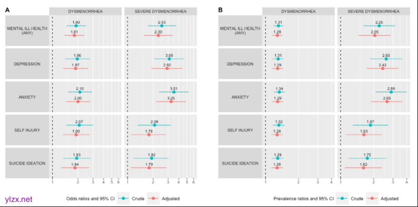 图1:与没有相同表现的同龄人相比,有心理健康问题表现的青春期女孩痛经和严重痛经的优势比(A)和患病率比(B)