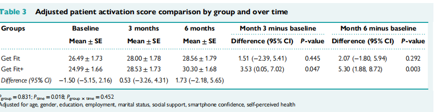 结果显示,参与者的平均年龄65.4 ± 6.0岁,多数为女性(61%)和已婚(61%)。两组在基线时社会人口学特征和患者激活得分无显著差异,且研究期间无不良事件报告。干预组在3个月(平均增加3.53分,P = 0.043)和6个月(平均增加4.37分,P = 0.014)时患者激活得分显著提高,而对照组改善不显著。调整潜在解释变量(年龄、性别、教育程度、就业状况、婚姻状况、社会支持、对智能手机的信心以及自我感知健康)后,结果未改变。在调整模型中,仅社会支持与患者激活总体增加相关(B = 5.14,P = 0.015)。