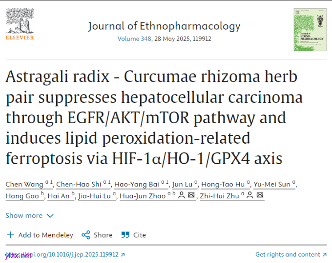 Wang C, Shi CH, Bai HY, et al. Astragali radix - Curcumae rhizoma herb pair suppresses hepatocellular carcinoma through EGFR/AKT/mTOR pathway and induces lipid peroxidation-related ferroptosis via HIF-1α/HO-1/GPX4 axis. J Ethnopharmacol. Published online April 30, 2025. doi:10.1016/j.jep.2025.119912
