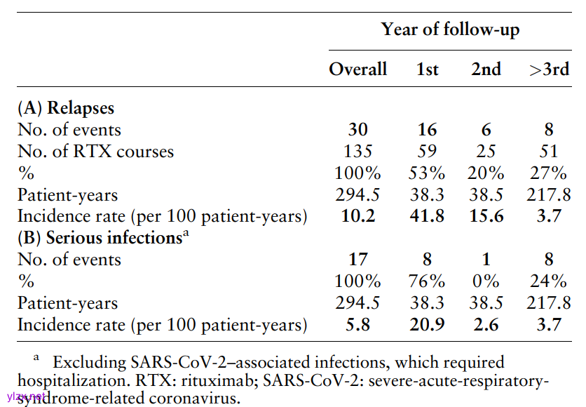 (A)复发与(B)严重感染的总体发生率及按RTX维持治疗开始后年份分层的发生率