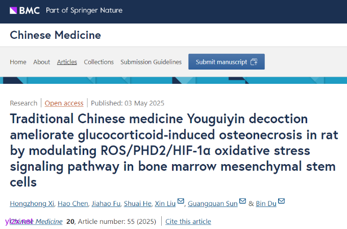 Xi H, Chen H, Fu J, et al. Traditional Chinese medicine Youguiyin decoction ameliorate glucocorticoid-induced osteonecrosis in rat by modulating ROS/PHD2/HIF-1α oxidative stress signaling pathway in bone marrow mesenchymal stem cells. Chin Med. 2025;20(1):55. Published 2025 May 3. doi:10.1186/s13020-025-01113-1