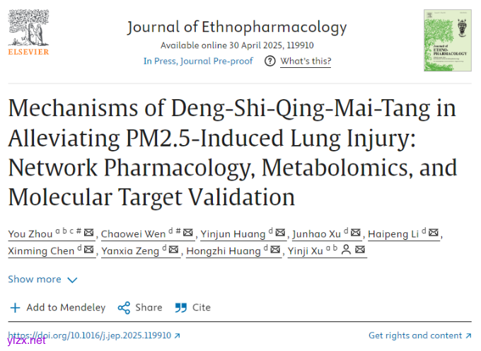 Zhou Y, Wen C, Huang Y, et al. Mechanisms of Deng-Shi-Qing-Mai-Tang in Alleviating PM2.5-Induced Lung Injury: Network Pharmacology, Metabolomics, and Molecular Target Validation. J Ethnopharmacol. Published online April 30, 2025. doi:10.1016/j.jep.2025.119910