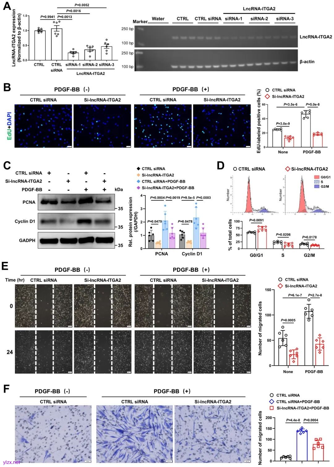 接着,后续体外功能实验证明,lncRNA-ITGA2可以显著促进血管平滑肌细胞的增殖、迁移、加速细胞周期进程。