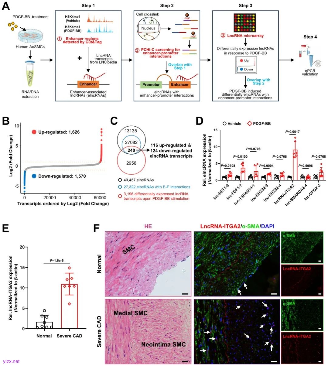 首先,研究者通过多重组学策略(CUT&Tag、PCHi-C测序及lncRNA芯片)筛选出PDGF-BB刺激下VSMC高表达的增强子相关长链非编码RNA (lncRNA-ITGA2),并验证其临床意义。RNA FISH与qPCR证实,lncRNA-ITGA2在冠心病患者冠脉组织中高表达,且与血管狭窄程度正相关,可作为疾病早期预警标志物;阻断lncRNA-ITGA2功能可能成为抑制血管增殖性疾病的新策略,弥补传统PDGF通路抑制剂的局限性。