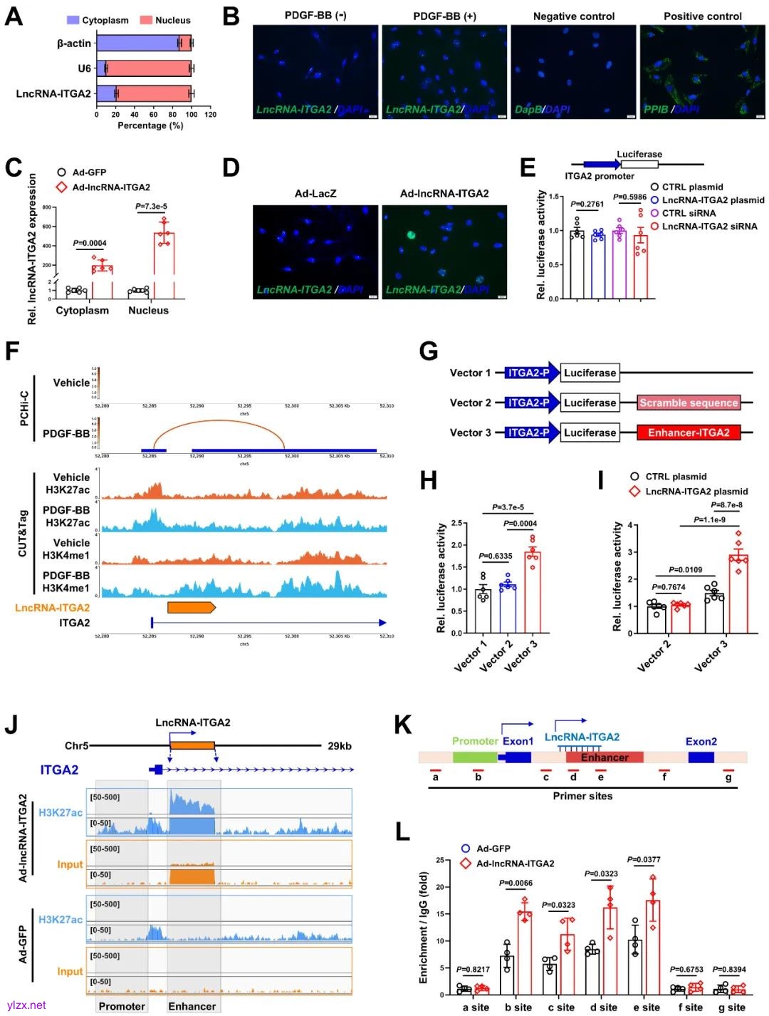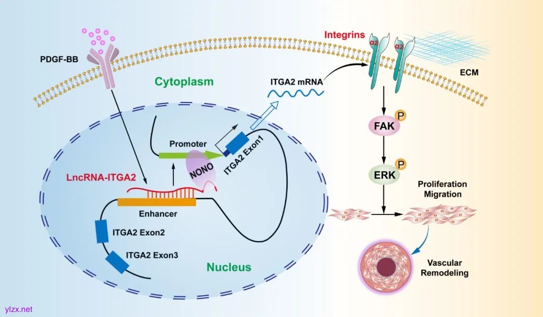 综上所述,该研究证实LncRNA-ITGA2为一种新型的增强子相关非编码RNA。它能够促进其宿主基因整合素ITGA2的增强子与启动子之间的相互作用,进而导致ITGA2的转录活性增加,最终促进VSMC的增殖与迁移。这些重要发现提示,LncRNA-ITGA2在血管重塑进程中可能扮演着关键角色,有望成为开发新型治疗策略的潜在靶点。
