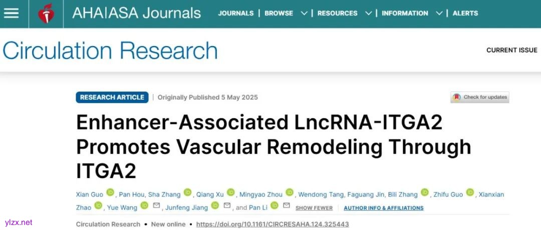2025年5月5日,海军军医大学长海医院心血管内科李攀副教授团队联合基础医学院组织胚胎教研室蒋俊锋副教授、转化医学研究中心/上海市细胞工程重点实验室王越教授在国际学术期刊Circulation Research上以Research Article形式发表了题为“Enhancer-associated LncRNA-ITGA2 promotes vascular remodeling through ITGA2”的研究成果,揭示了增强子相关长链非编码RNA (lncRNA-ITGA2)通过三维基因组调控促进血管增殖性疾病(如动脉粥样硬化、支架内再狭窄)的新机制,为临床治疗提供全新靶点。