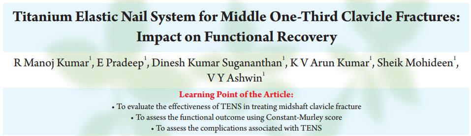 近年来,手术治疗作为一种更可靠的选择越来越受到青睐,特别是对于移位骨折,因为手术干预的骨不连和畸形愈合发生率较低。手术治疗方案包括使用钢板和螺钉进行切开复位内固定(ORIF),以及使用钛弹性髓内钉系统(TENS)等器械进行髓内固定。 虽然钢板切开复位内固定被认为是金标准,但它存在一些并发症,如切口大、广泛的软组织损伤、失血增加,以及潜在的神经或血管损伤。其他问题还包括感染、影响美观的疤痕,以及钢板取出后的应力遮挡,这可能导致再骨折。相比之下,钛弹性髓内钉系统于2002年首次推出,具有几个优点,包括切口较小、软组织破坏较少,以及负荷分担固定方式,这种方式允许骨折部位产生微动,促进骨痂形成。尽管存在一些风险,如内固定物刺激或植入物移位,但钛弹性髓内钉系统已显示出良好的临床和功能治疗效果。本研究重点关注解决移位的锁骨中段骨折治疗所面临的挑战。保守治疗往往会导致骨不连或畸形愈合等并发症,而钢板固定手术则会造成明显的组织破坏和可见的疤痕。钛弹性髓内钉系统提供了一种侵入性较小的替代方案,旨在促进恢复、减少并发症并获得更好的美观效果。通过Constant-Murley评分评估功能恢复情况,结合影像学结果和相关并发症,本研究旨在确定钛弹性髓内钉系统作为此类骨折的一种更优治疗方法的有效性。