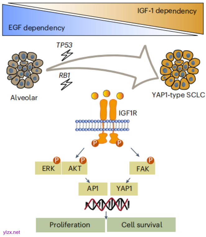 为了深入理解IGF-1依赖性的分子机制,研究人员分析了IGF1R下游的信号通路。结果显示,IGF-1刺激可以显著增加非NE型SCLC类器官中AKT和ERK的磷酸化水平,而这种激活可以通过IGF1R抑制剂linsitinib得以抑制。进一步的研究发现,非NE型SCLC类器官中AP1家族成员FOSL1的表达水平显著高于NE型SCLC类器官,并且这种表达受到AKT的调控。此外,IGF-1刺激还可以诱导YAP1的核转位,并激活其下游靶基因CYR61的表达。这些结果表明,IGF-1通过IGF1R激活了AKT-AP1和FAK-YAP1信号通路,从而促进了非NE型SCLC的增殖。