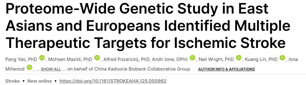 Yao P ; China Kadoorie Biobank Collaborative Group. Proteome-Wide Genetic Study in East Asians and Europeans Identified Multiple Therapeutic Targets for Ischemic Stroke. Stroke. 2025 Apr 30. doi: 10.1161/STROKEAHA.125.050982.