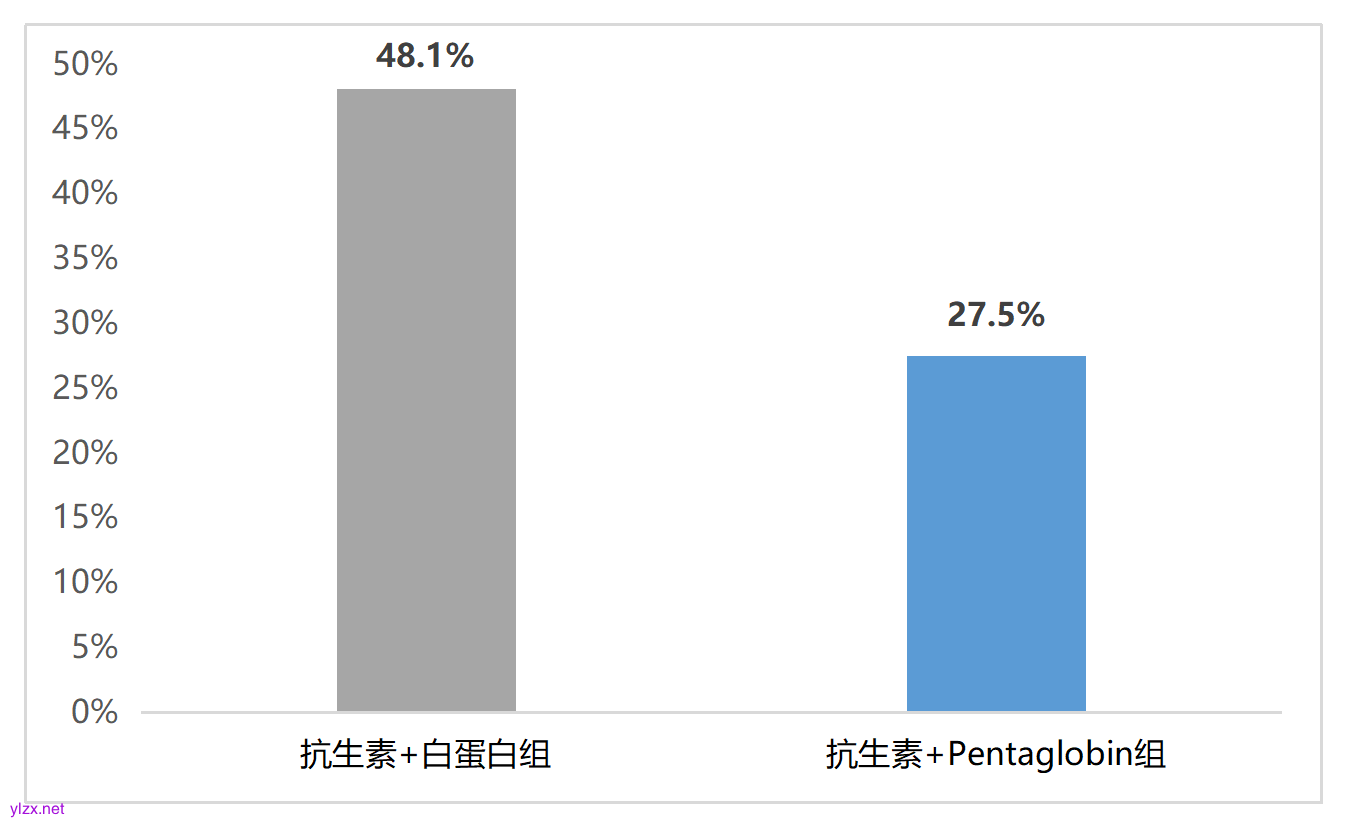 一项前瞻性、随机、双盲、对照研究,纳入56例由腹腔内感染引起的严重脓毒症和脓毒性休克患者,均为症状出现后24小时内入住ICU,且由腹腔内感染引起的严重脓毒症和脓毒性休克患者,患者被随机分配接受富含IgM的IVIG(IVIG组,Pentaglobin剂量为7 mL/kg/天,持续5天),或等量5%人白蛋白治疗(对照组)。结果显示,与接受抗生素加白蛋白治疗的患者相比,而接受抗生素加IVIG治疗的患者的死亡率更低(P = 0.06,图2)。表明,富含IgM的IVIG联合适当的抗生素治疗可提高腹腔脓毒症手术患者的生存率 10。