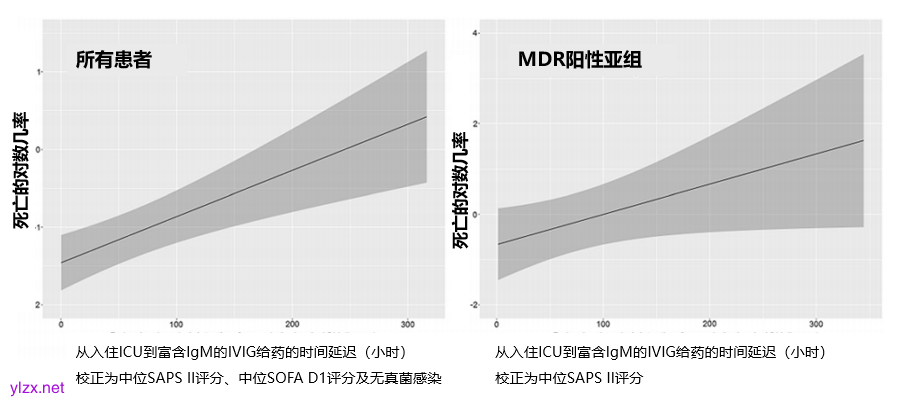 图7 多变量Logistic回归模型:针对全体患者群体,展示富含IgM的IVIG给药延迟对ICU内死亡概率的影响(实线),并校正至中位SAPS II评分、SOFA D1评分及无真菌感染状态,95%CI以灰色区域表示(左图)。针对MDR阳性患者,校正至SAPS II评分中位数后进行对比(右图)。