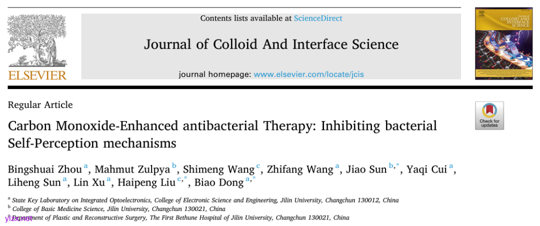 吉大董彪团队J. Colloid. Interf. Sci.:CO气体分子增强抗菌治疗效果——抑制细菌自我感知机制