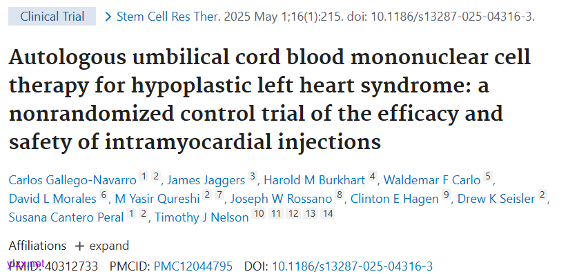 Gallego-Navarro C, Jaggers J, Burkhart HM, Carlo WF, Morales DL, Qureshi MY, Rossano JW, Hagen CE, Seisler DK, Peral SC, Nelson TJ. Autologous umbilical cord blood mononuclear cell therapy for hypoplastic left heart syndrome: a nonrandomized control trial of the efficacy and safety of intramyocardial injections. Stem Cell Res Ther. 2025 May 1;16(1):215. doi: 10.1186/s13287-025-04316-3. PMID: 40312733; PMCID: PMC12044795.