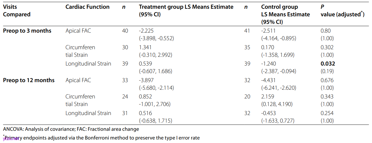 1. 心脏功能:短期(3个月)评估显示,治疗组右心室纵向应变较对照组显著恶化(LS均值差异1.78,p=0.032),而FAC(治疗组-2.23% vs 对照组-2.51%,p=0.80)与环向应变(p=0.302)无差异。长期(12个月)两组所有心脏功能指标均无统计学差异(p>0.05)。