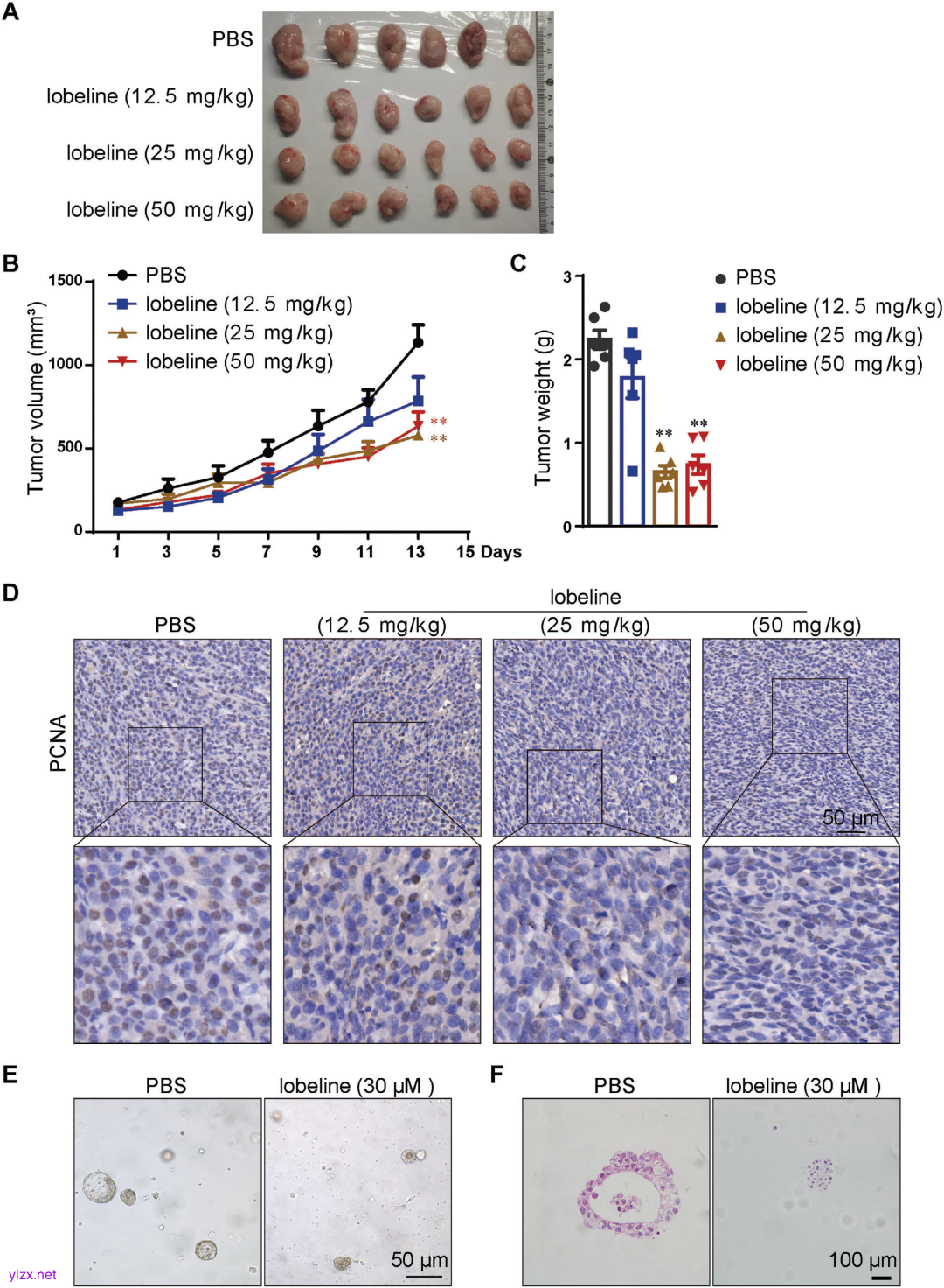 在 MC38 异种移植小鼠模型中,洛贝林以剂量依赖性方式显著抑制肿瘤生长,降低肿瘤体积和重量。组织病理学分析显示,洛贝林处理组肿瘤组织中的增殖细胞核抗原(PCNA)蛋白水平降低,表明癌细胞增殖受到抑制。同时,在 CT26 异种移植模型和人结直肠癌类器官中,洛贝林也展现出抑制肿瘤生长的效果。