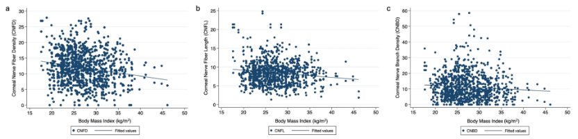 综上所述,肥胖,尤其是较高的BMI,会对糖尿病患者的角膜神经健康产生不利影响。对于伴有肥胖的糖尿病患者,应考虑评估角膜神经及其由此导致的角膜病变。