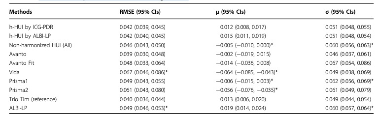研究共评估了 498 名患者(平均年龄 68.0 岁 ±11.6 岁;男性 320 名)。在每个磁共振系统中,HUI、ICG-PDR 和 ALBI-LP 之间均观察到具有统计学意义的线性相关性,从而确定了用于 HUI 校准的转换因子。推导出校准公式:校准后的 HUI(h-HUI) = HUI・(Slope2'/-1.425)・0.955,其中 Slope2' 表示每个磁共振系统中 HUI 与 ALBI-LP 之间的回归斜率。与未校准的 HUI(0.060,[0.056-0.063])或 ALBI-LP(0.060,[0.057-0.064])相比,使用基于 ALBI-LP 校准后的 h-HUI 来估计 ICG-PDR 的误差标准差显著更小(0.051,[0.048-0.054]),且与基于 ICG-PDR 校准后的 h-HUI(0.051,[0.045,0.055])相当。