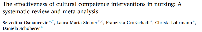 Selvedina Osmancevic, Laura Maria Steiner, et al, The effectiveness of cultural competence interventions in nursing: A systematic review and meta-analysis, International Journal of Nursing Studies, 2025, https://doi.org/10.1016/j.ijnurstu.2025.105079.