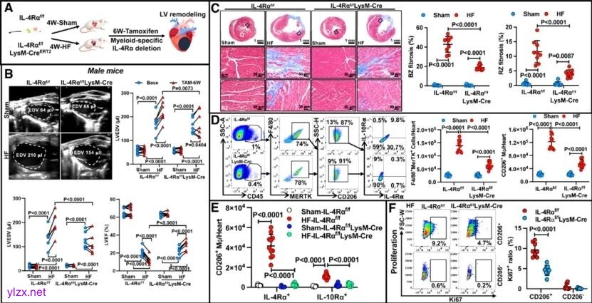 图3. 在体IL-4Rα表达抑制可清除心衰心脏CD206+巨噬细胞亚群及逆转左室重构