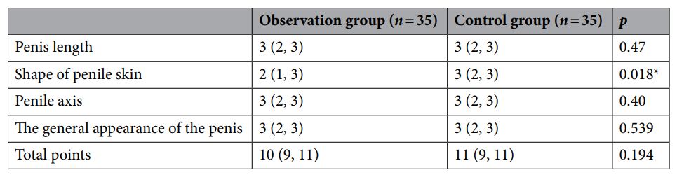 4. 外观评分:术后6月,对照组在包皮形态评分(3分 vs. 2分,p=0.018)优于观察组,但总体PPPS评分(10分 vs. 11分,p=0.194)无统计学差异。