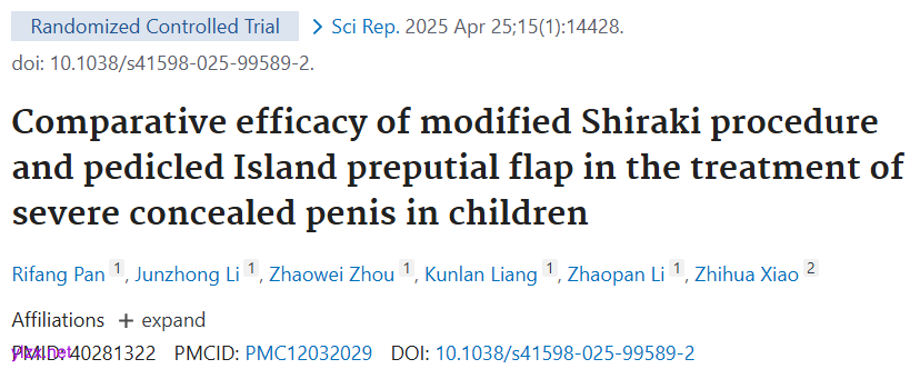 Pan R, Li J, Zhou Z, Liang K, Li Z, Xiao Z. Comparative efficacy of modified Shiraki procedure and pedicled Island preputial flap in the treatment of severe concealed penis in children. Sci Rep. 2025 Apr 25;15(1):14428. doi: 10.1038/s41598-025-99589-2. PMID: 40281322; PMCID: PMC12032029.
