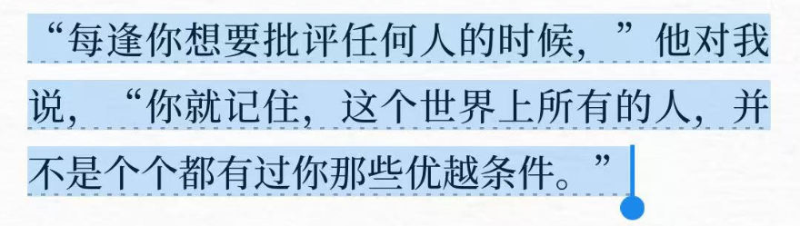 “我年纪还轻,阅历不深的时候,父亲教导过我一句话,我至今还念念不忘:每逢你想要批评任何人的时候你就记住,这个世界上所有的人,并不是个个都有过你那些优越条件。”