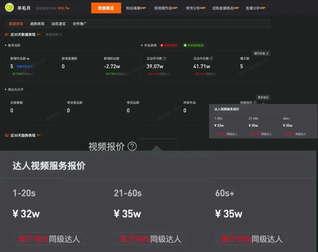 第三方平台显示,他的单则视频报价为30w+,