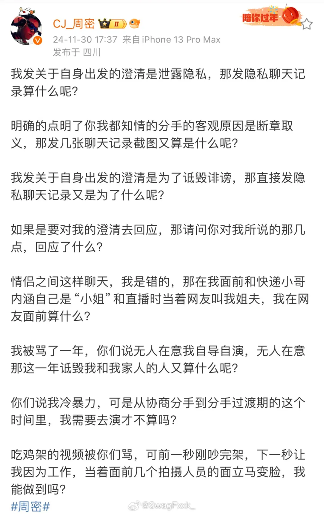 可以看出,周密这篇长文的核心诉求是希望说出真正的分手原因解决他和家人被网暴的困境。