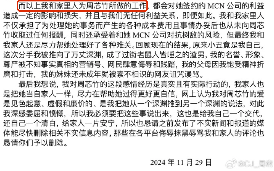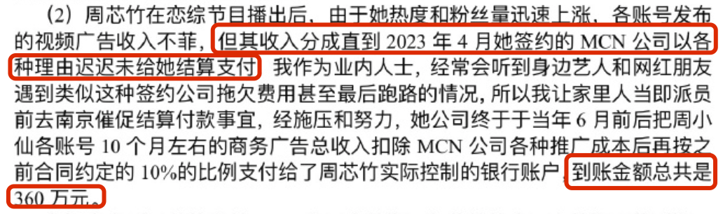 不仅如此,他还帮周芯竹讨回了被MCN公司拖欠了近一年的费用360万元⬇️