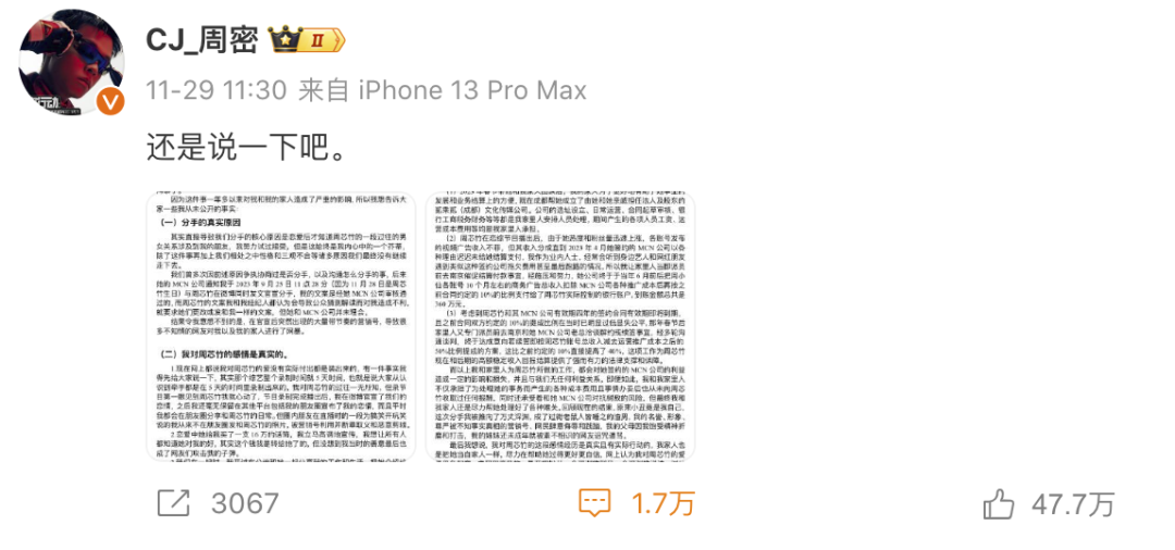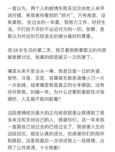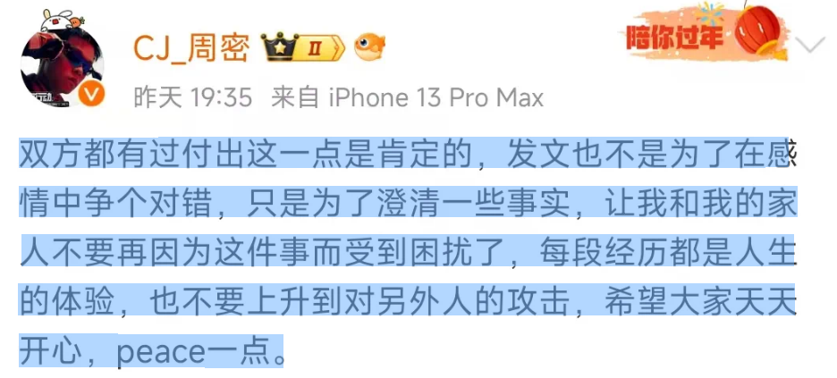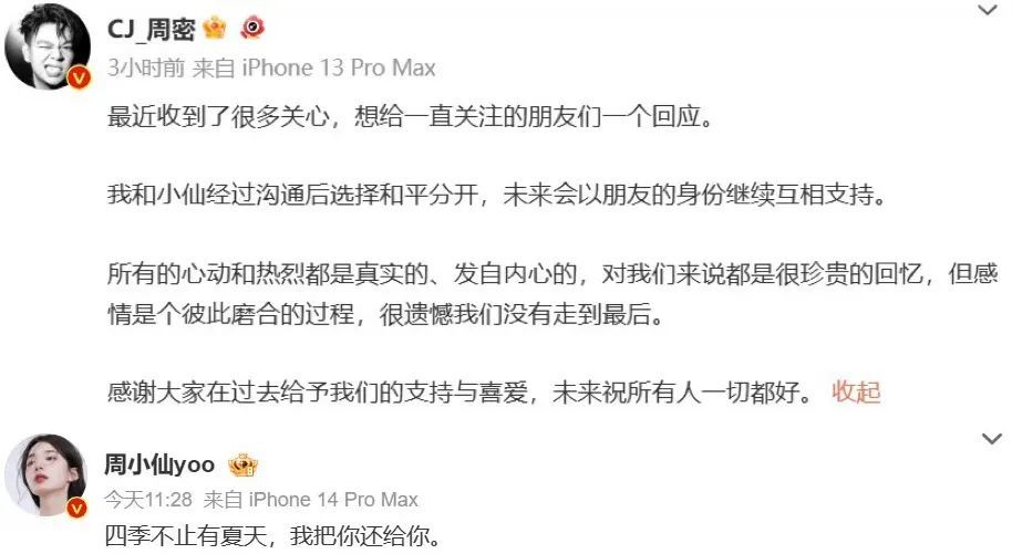 发布完这篇长文后,周密又补充了一条:不是为了在感情中争个对错,只是为了澄清一些事实,不想让家人受到困扰。