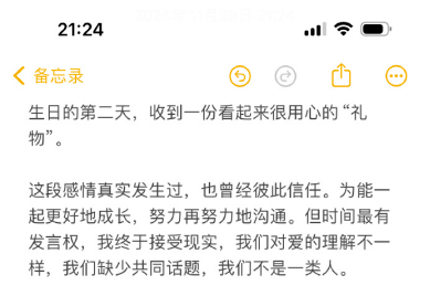 解释了两个人真正的分手原因:双方对爱的理解不一样,缺少共同话题,本质上不是一类人。