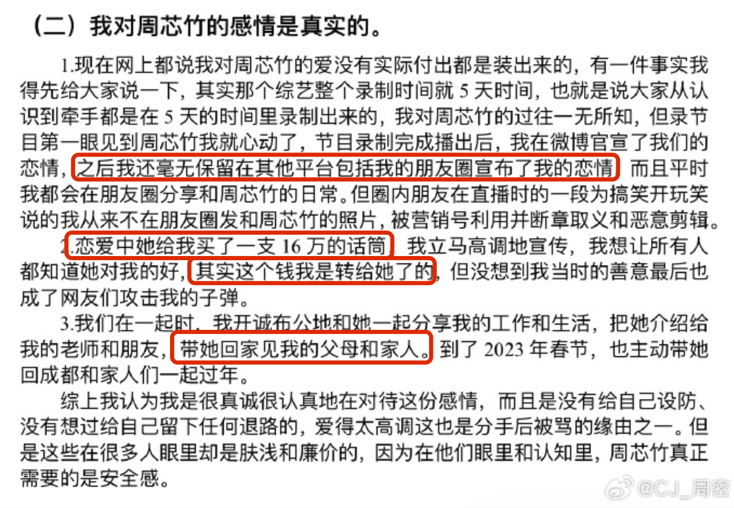 交代分手原因只是其一,之后周密又进一步强调自己对周芯竹的感情有多真。