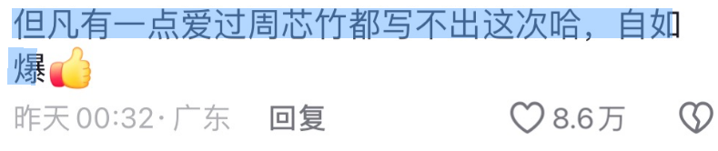 在这样的嘲讽和阴阳怪气之下,周芯竹依然保持得体:爱是心疼是呵护是关怀,不是不耐烦和贯穿一天的聊性。