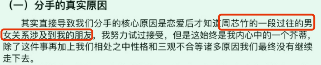 周密称,两个人真正的分手原因是他在恋爱后才得知周芯竹过往的一段男女关系涉及了自己的朋友,为此他心生芥蒂。