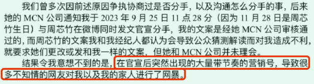 在发文前,他和自己的经纪人一致认为,周芯竹的文案会引起猜测和解读,从而对周密产生不利影响。