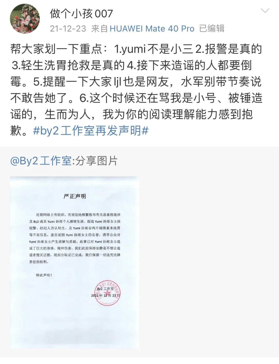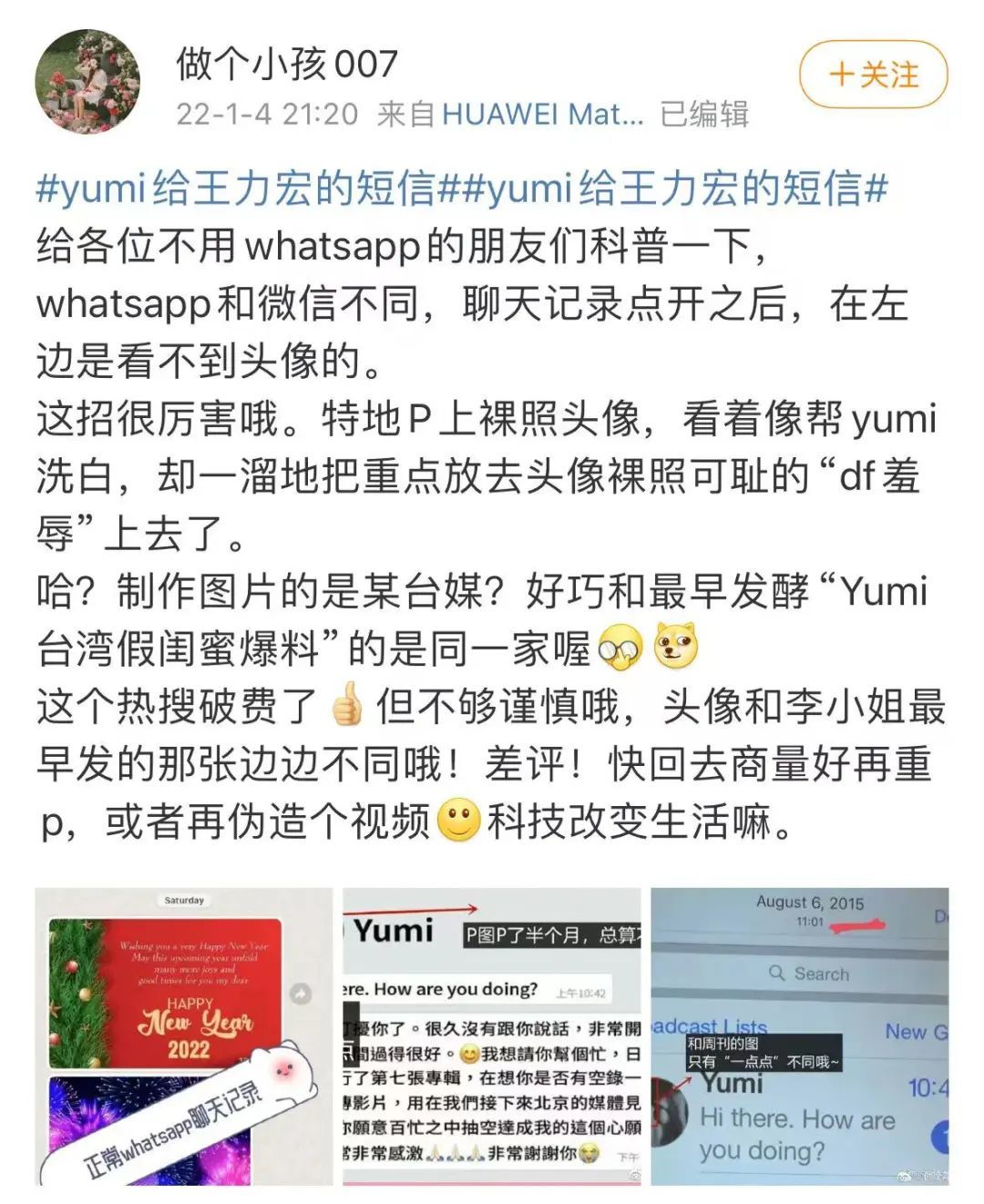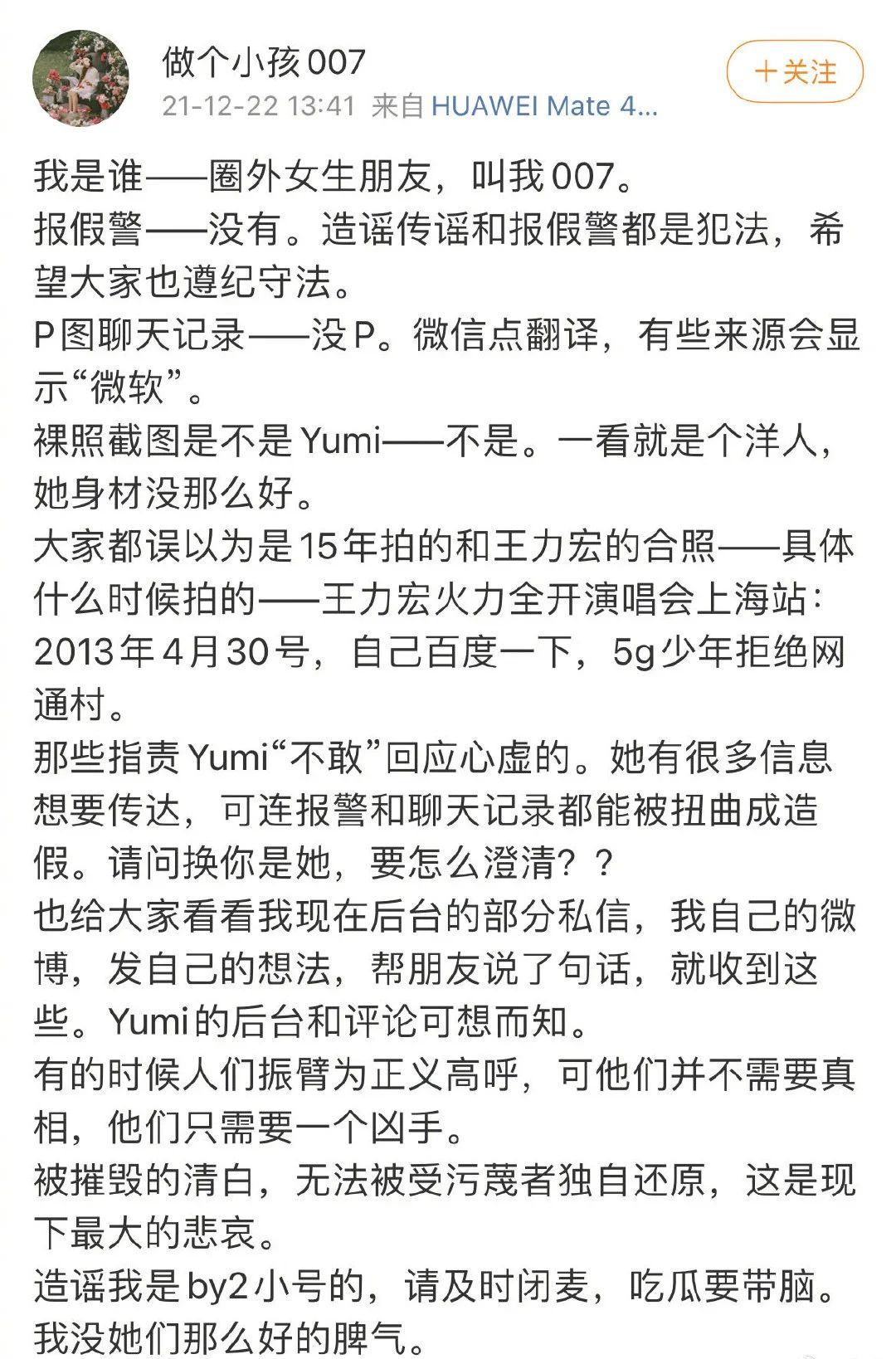 当时网友@做个小孩007 曝光了Yumi的情况,还针对网络上的舆论进行了种种回应。