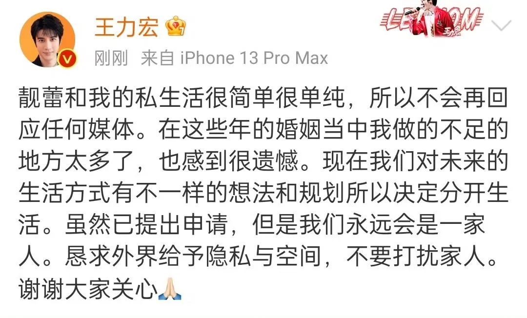2021年王力宏宣布与李靓蕾离婚,声称是和平分手。