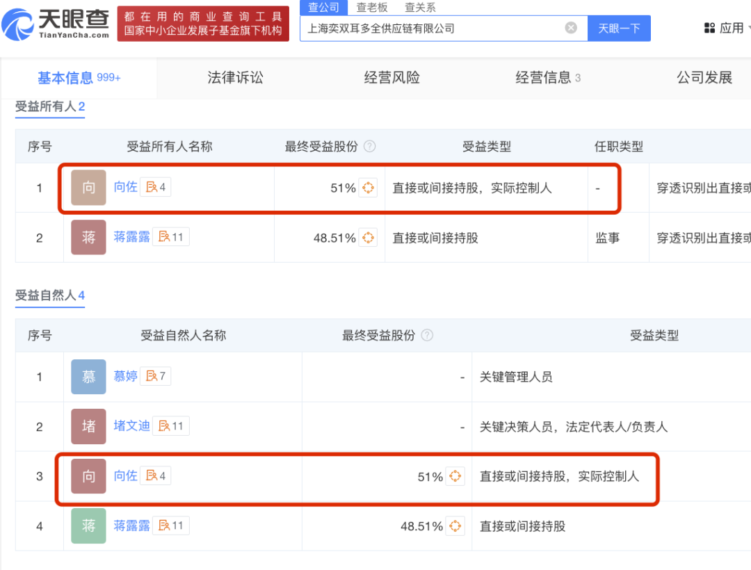 名为「奕双耳多」的公司受益人是向佐(受益股份51%),