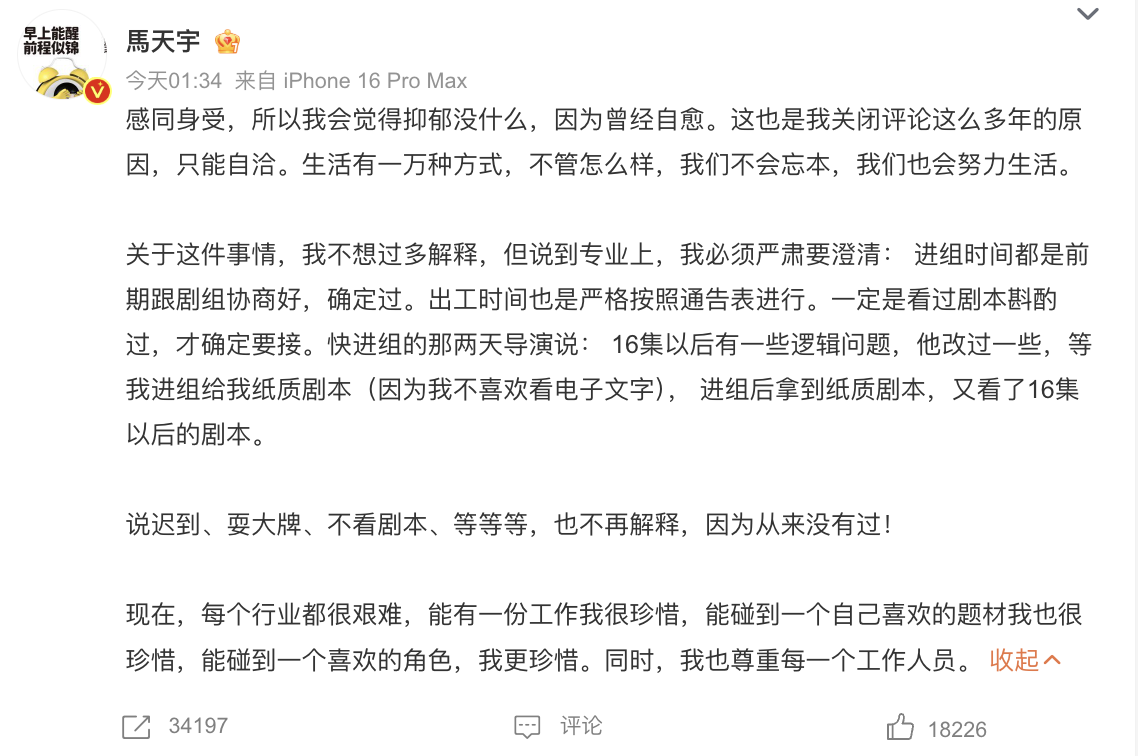 01:34:马天宇再次发文,针对相关事件进行了澄清。他表示自己进组时间是和剧组协商确定好的,出工也是按照通告表来执行,并且强调是在仔细看过剧本之后才接下这部戏,明确否认了诸如迟到、耍大牌、不看剧本等传闻,同时还表达了自己对这份工作、剧集题材以及所饰演角色的珍惜之情,也表明了尊重剧组工作人员的态度。