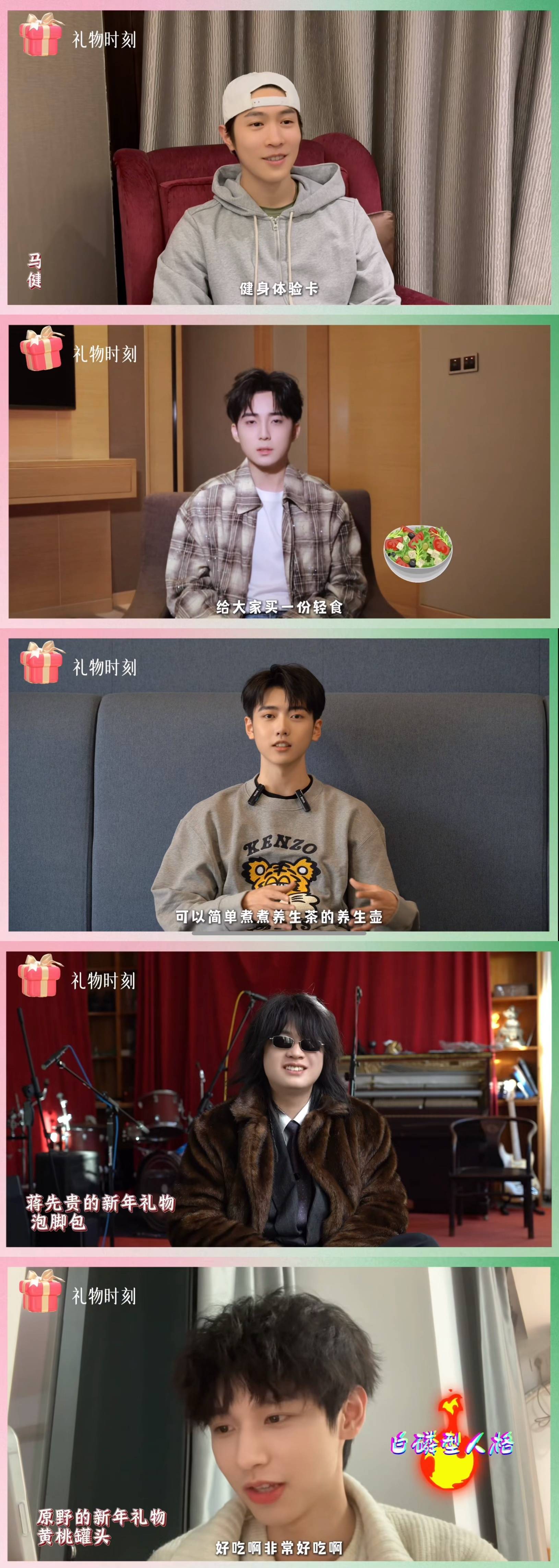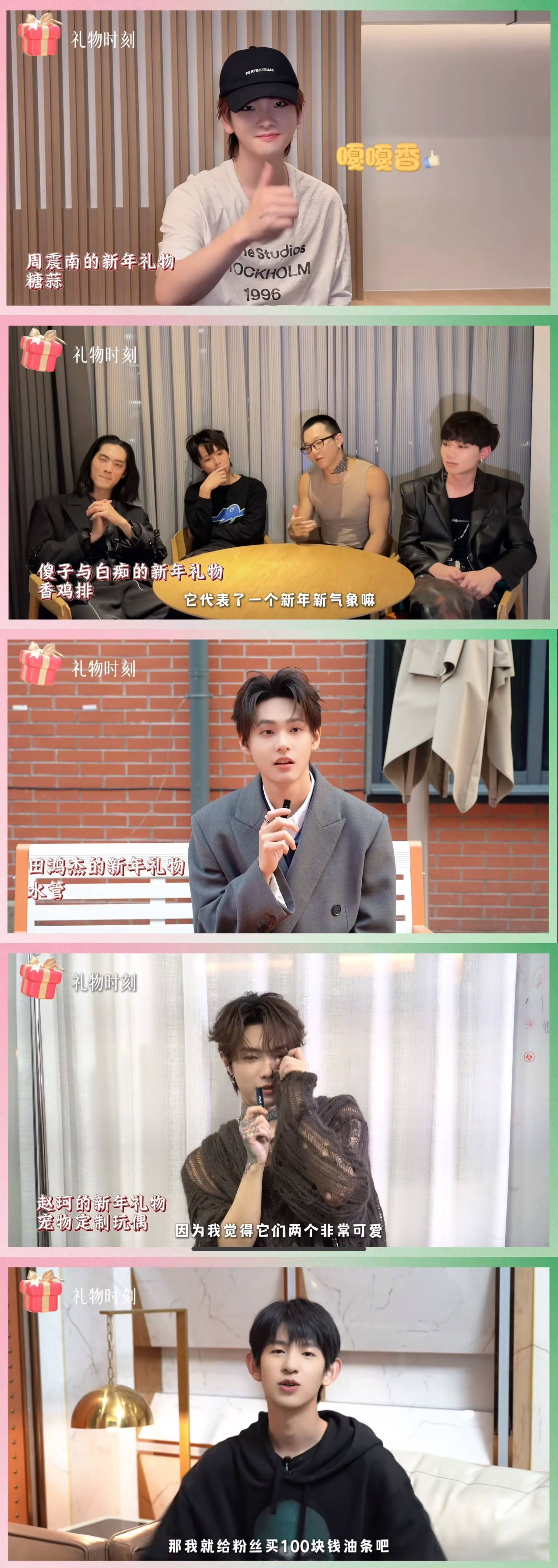 抽象派则是让粉丝在高兴之余感到一丝的疑惑与搞笑,比如周震南不仅选择糖蒜,还和工作人员展开了对糖蒜物价的探讨,并指定所有糖蒜送给一位幸运粉丝,强制养成爱糖蒜的习惯,这带味儿的强制爱也是令人羡慕了;傻子与白痴不假思索地选择香鸡排作为新年礼物,用酥脆好鸡排,祝福粉丝新的一年能够嘣呲嘎次;气运联盟田鸿杰为粉丝倾情选择水管奉上,遇水则发的好兆头就说谁不想拥有?气运联盟赵珂为大家挑选了一对麻球和马达的定制小玩偶,用一对小公猫好友祝福大家甜甜蜜蜜,哇人的抽象手拿把掐没错了;朱衍丞一本正经要送大家油条,理由是可以在海边喂海鸥,就是说现在码头的海鸥已经不整薯条了吗?奇怪的知识又增加了!