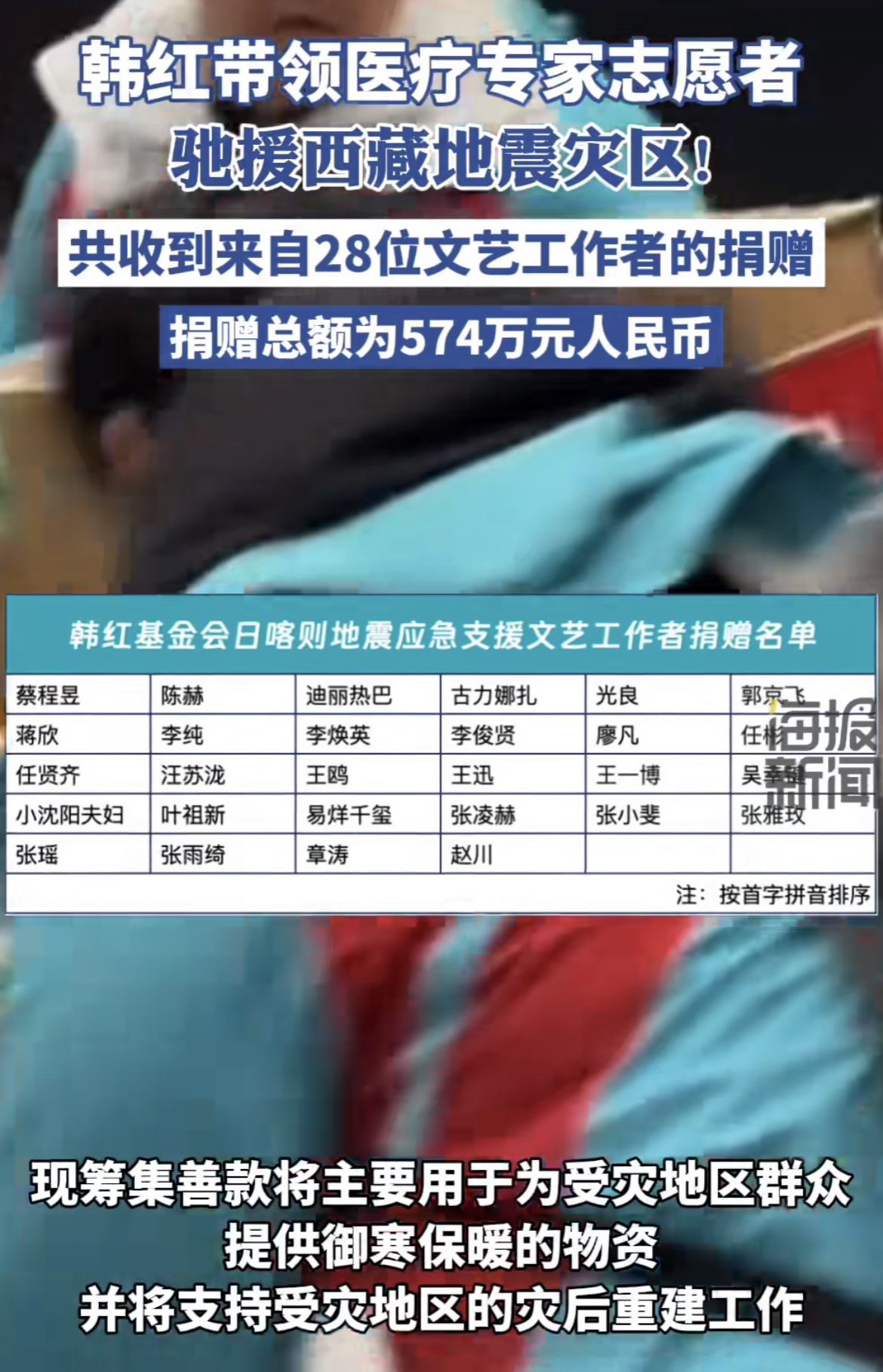 韩红携手28位文艺工作者为西藏地震灾区捐款574万元